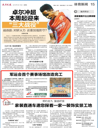 武漢軍運(yùn)會相關(guān)場館設(shè)施項目計劃在明年4月全面竣工。