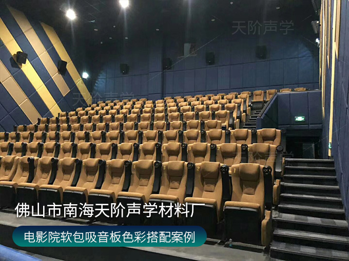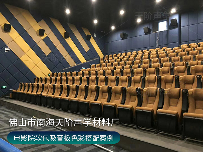 活力亮眼的黃色+灰色調(diào)電影院,墻面選用有防撞效果的軟包吸音板,拼色安裝設(shè)計(jì),做不燃處理,舒適又安心,吸收噪音雜音很有效果。