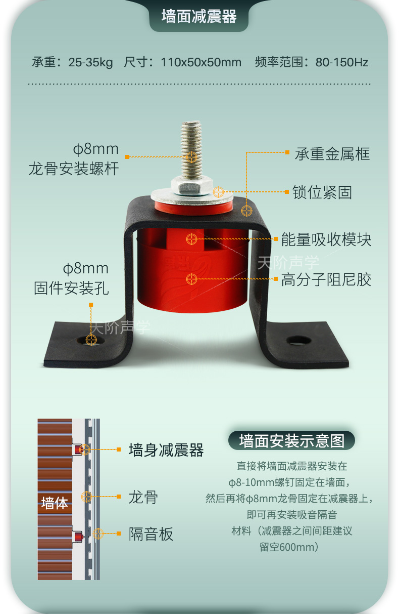 天花墻體隔音減震器是用于天花墻體隔音的必要構(gòu)件。它特有的阻尼橡膠塊可以切斷聲橋的傳播,尤其對KTV、酒吧里有低音炮的地方,這是重要的隔音系統(tǒng)配件,不然,無論多少隔材料都無法將聲音阻隔于包廂房內(nèi)。