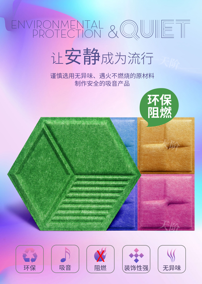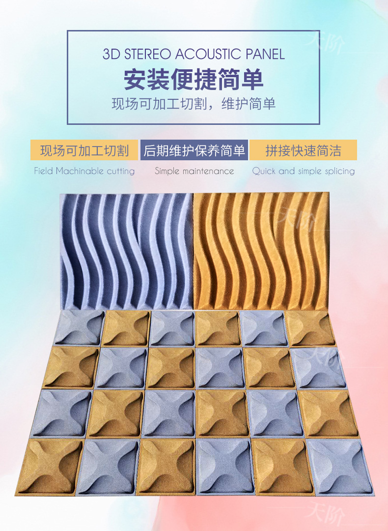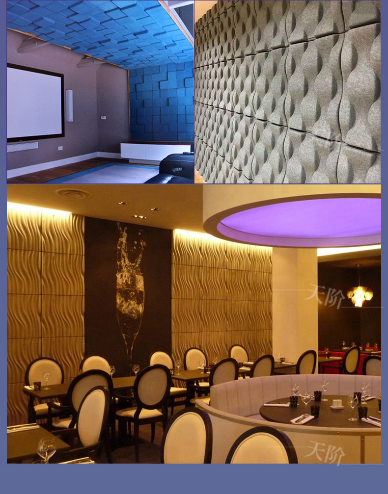 3D聚酯纖維吸音板是今年新研發(fā)產(chǎn)品,采用的是綠色環(huán)保高新技術(shù)熱壓合成繭棉形狀的纖維板材,具有環(huán)保,防火,吸音,3D效果裝飾性更立體,易安裝等功能。