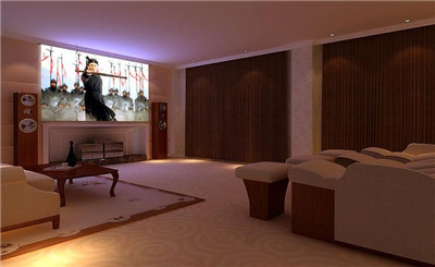 一般建議采用簡潔處理,在處理好吊頂骨架的強(qiáng)度的情況下,特別是處理好音箱吊掛位的強(qiáng)度,并要作好記號(hào),頂部采用石膏板,四周采用石膏成型模塊,周遍采用輕巧的木制幾何結(jié)構(gòu)襯底就可以了。這樣可以配合暗藏的三基色彩燈,相成光折射組合。