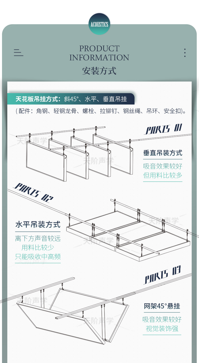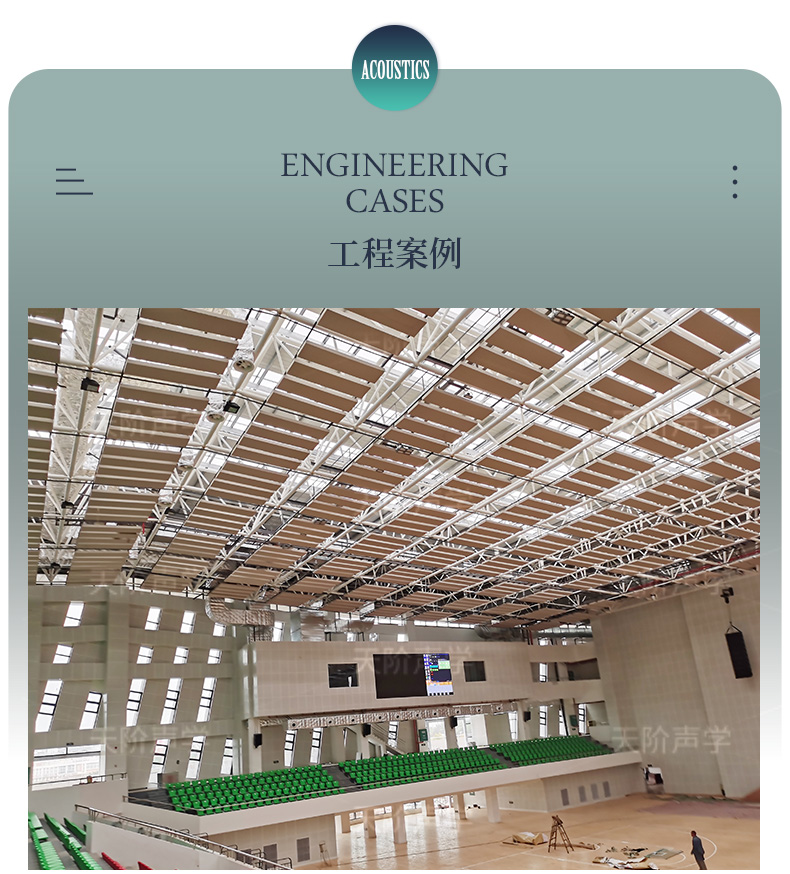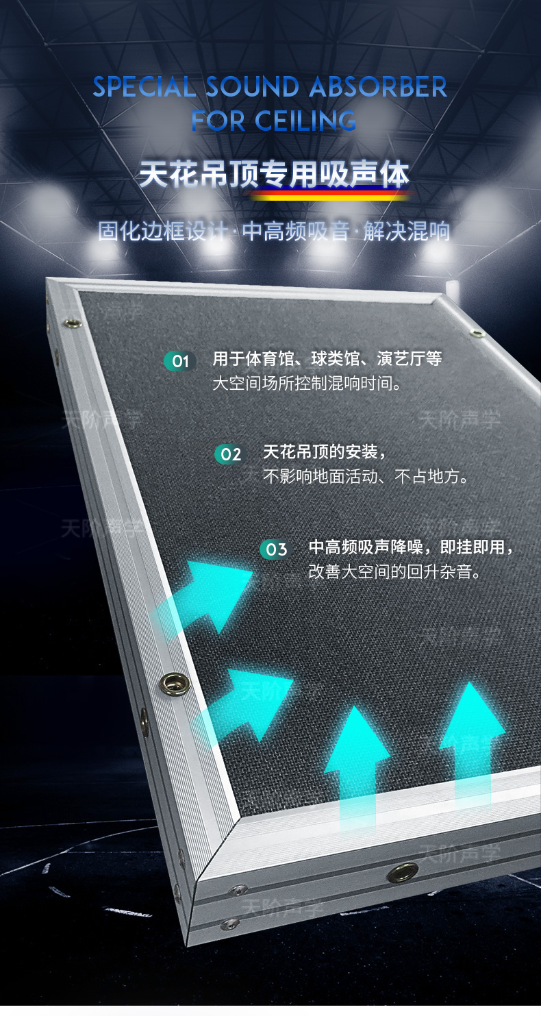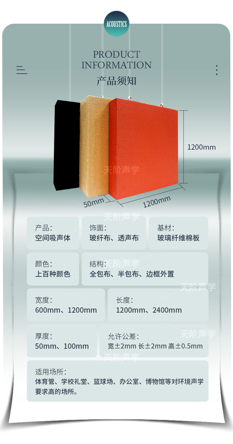 您現(xiàn)在的位置首頁 ? 槽木木質(zhì)吸音板 - 軟包 - 防火吸音板 - 聲學(xué)產(chǎn)品 ? 空間吸聲體體育館吊頂吸音板 內(nèi)包布鋁框平板空間吸聲體