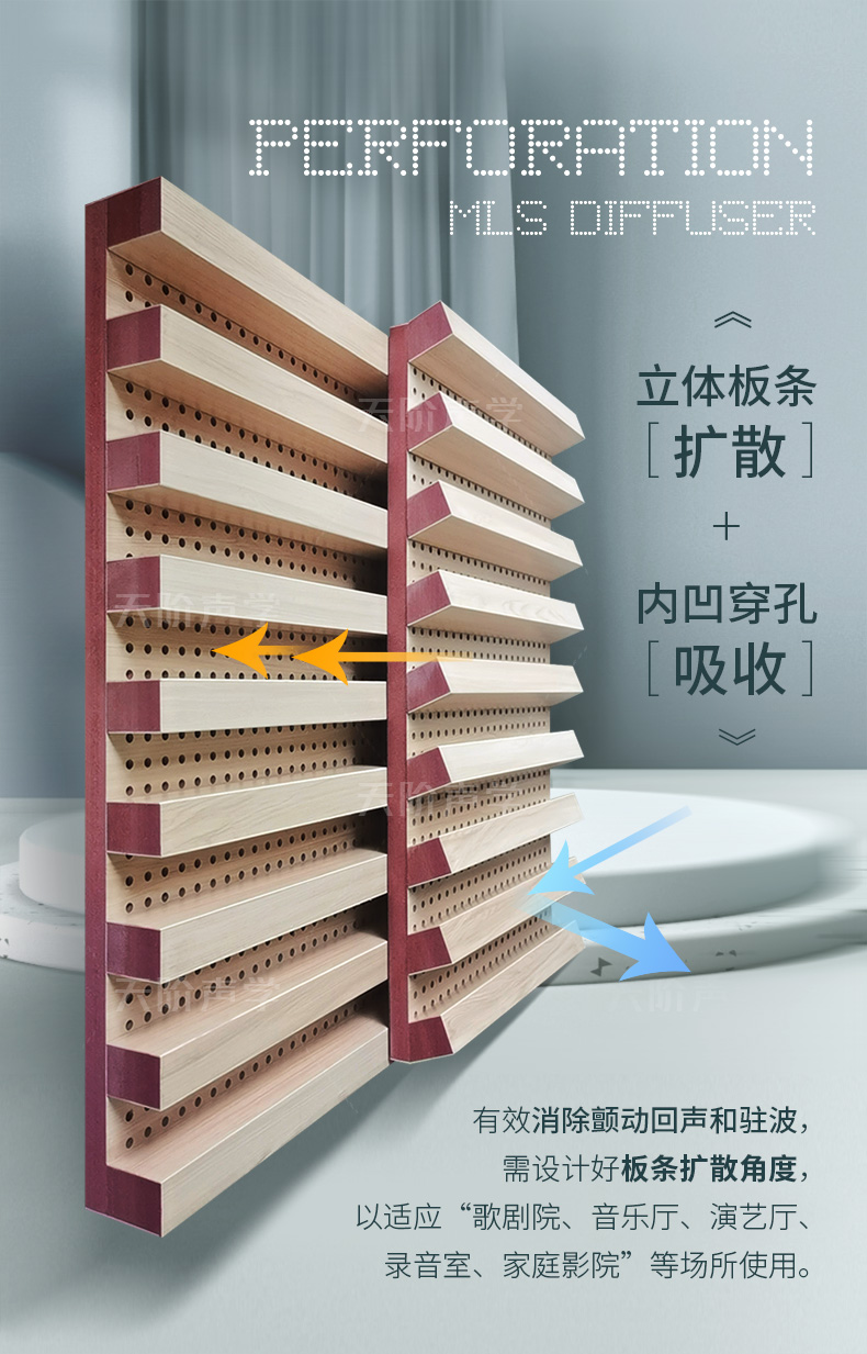 擴(kuò)散是指聲音朝著許多方向不規(guī)則反射、折射和衍射的現(xiàn)象。擴(kuò)散對(duì)“豐滿度”、“活躍度”、“空間感”是有利的,并且能保持豐滿和明晰度之間的平衡,語言清晰度和較長(zhǎng)混響時(shí)間之間的平衡,還可以保持觀眾廳內(nèi)音調(diào)的自然性。可以讓室內(nèi)聲能分布均勻,清除回聲等。室內(nèi)擴(kuò)散不好,音色往往很粗糙。擴(kuò)散體就是為改進(jìn)聲場(chǎng)擴(kuò)散性能所采用的布置,設(shè)計(jì)依據(jù)是利用不規(guī)則界面改變發(fā)射聲的波前,或者改變聲阻抗。